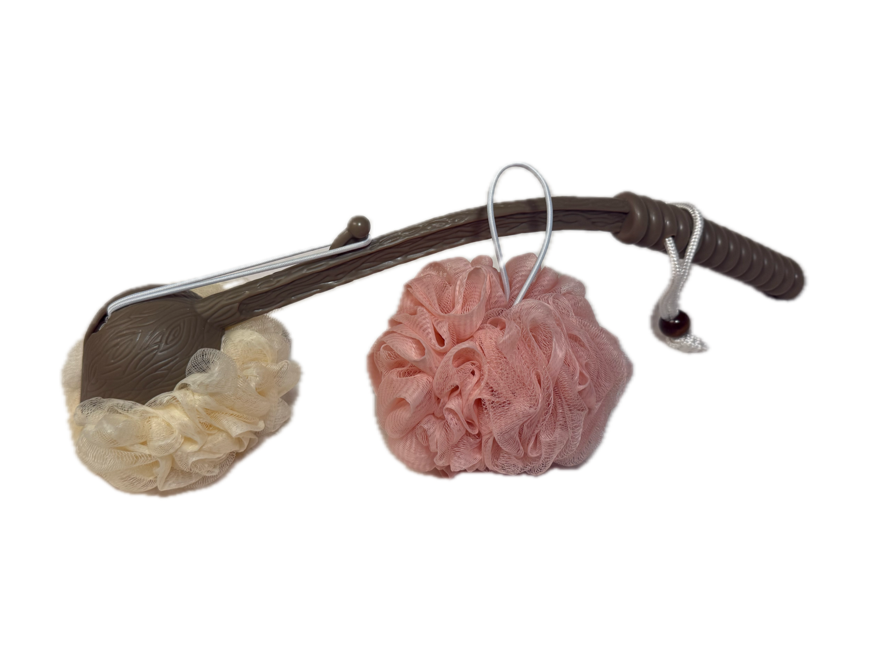 - (2) Premium loofahs with reinforced elastic cords — shipped with every wand - Rice White & Pink